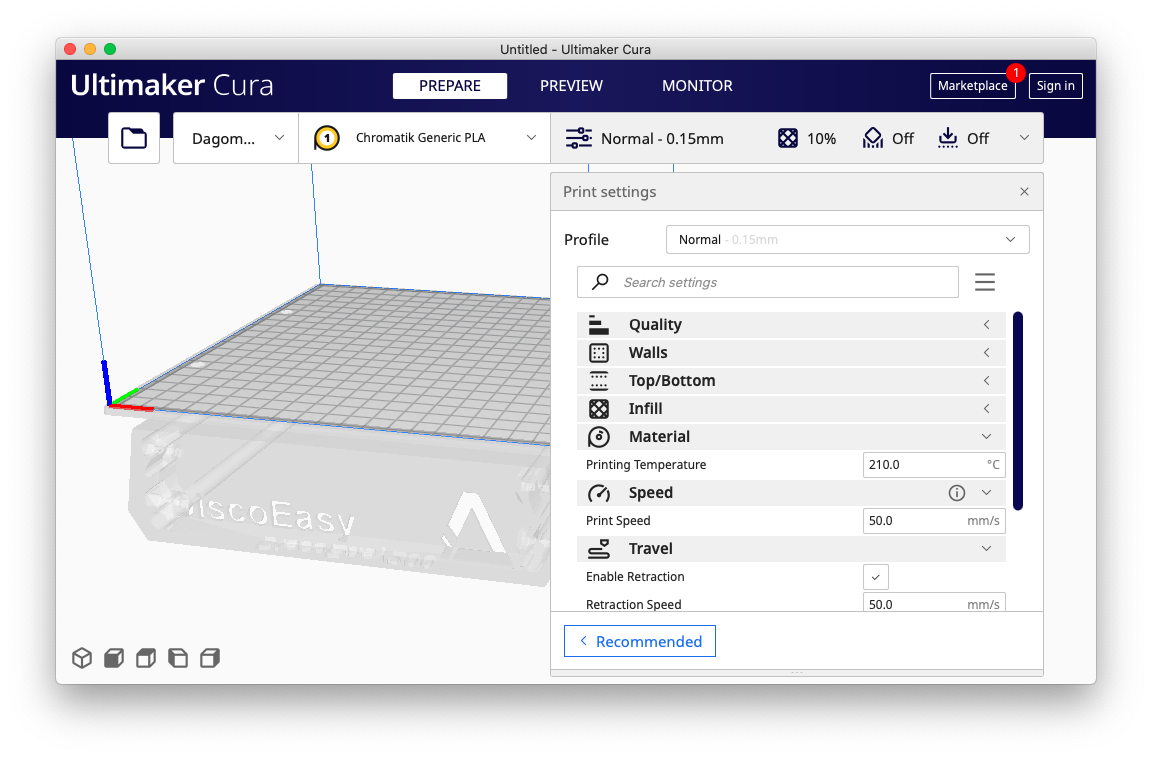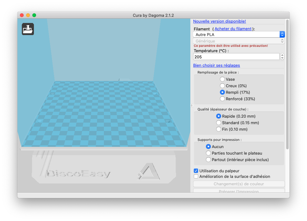 Couramment appelé "Cura", c'est un logiciel populaire. Il possède une liste de machines pré-configurées, et la Dagoma DiscoEasy200 en fait partie. Les réglages de base sont fonctionnels. De base l'interface n'affiche que les réglages "basiques", mais il est possible d'en afficher d'autres et/ou passer en mode avancé ou expert.